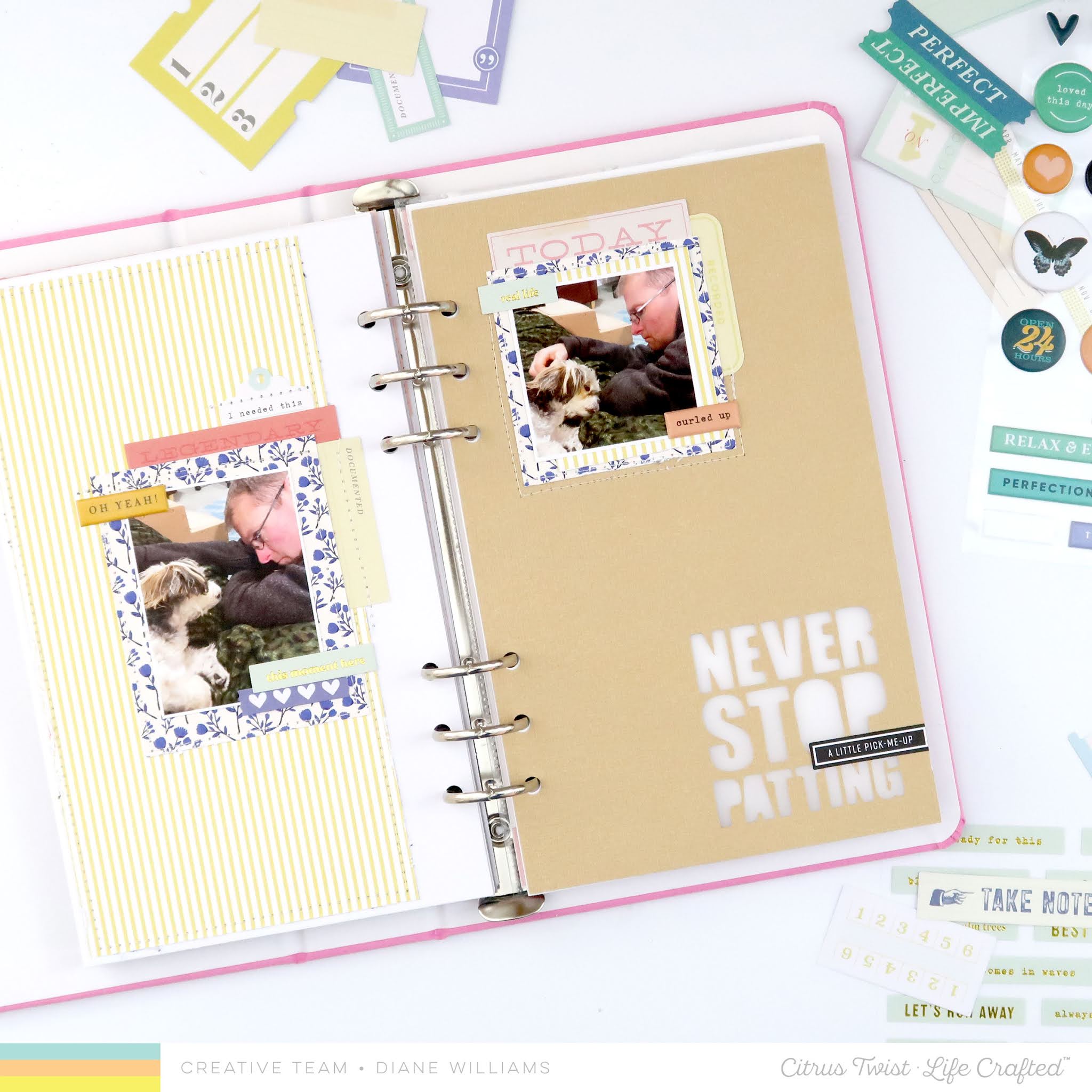 Citrus Twist Kits shop. I cut my title using my Silhouette so I added some vellum in behind it to make the die cut title a bit more durable since it is outside the pocket. This also provided the perfect spot for a bit of hidden journalling!