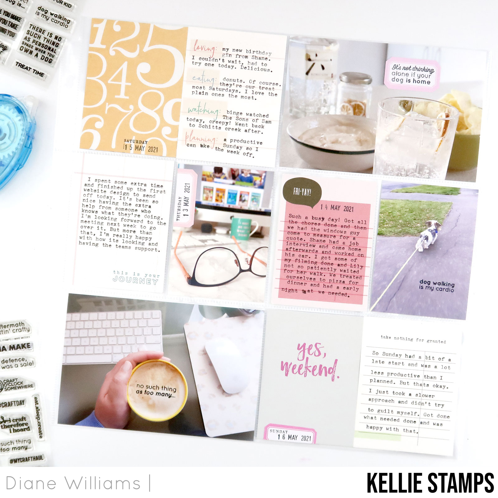 Despite committing to taking photos for Week in the Life, I decided to take my Patrons advice and not put together an album this year. Instead, I added a double page spread into my Project Life album using bits from my stash and two soon-to-be-released stamps sets from Kellie Stamps.